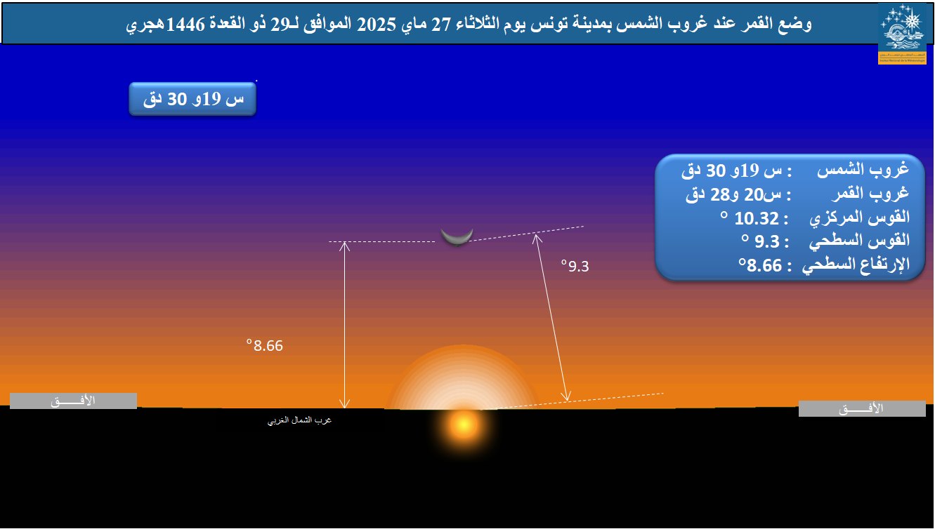 تُجرى عملية رصد هلال شهر ذي الحجة لسنة 1446 هجري بعد غروب شمس يوم الثلاثاء المقبل 27 ماي 2025 الموافق لـ29 من ذي القعدة 1446 هجري.