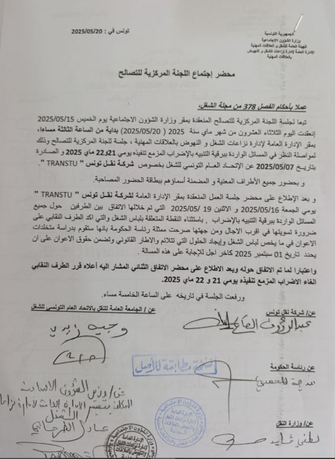 أعلنت الجامعة العامة للنقل في بلاغ لها الثلاثاء 20 ماي 2025، عن إلغاء إضراب أعوان شركة نقل تونس، الذي كان مقررا يومي 21 و 22 ماي 2025 وذلك بعد التوافق على جميع النقاط الواردة في برقية التنبيه بالإضراب الصادرة بتاريخ 7 ماي 2025.