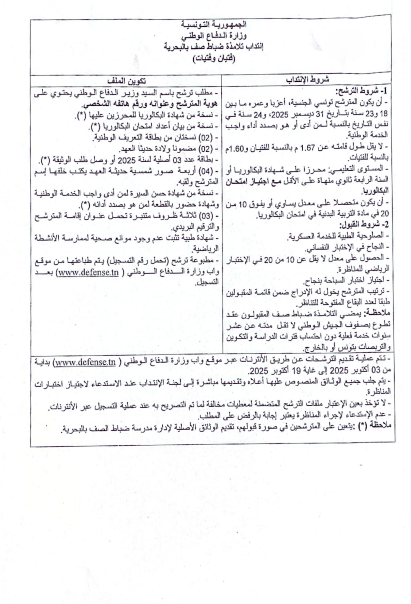 وتتم عملية تقديم الترشحات عن طريق موقع واب الوزارة www.defense.tn انطلاقا من اليوم وإلى غاية 19 أكتوبر2025.