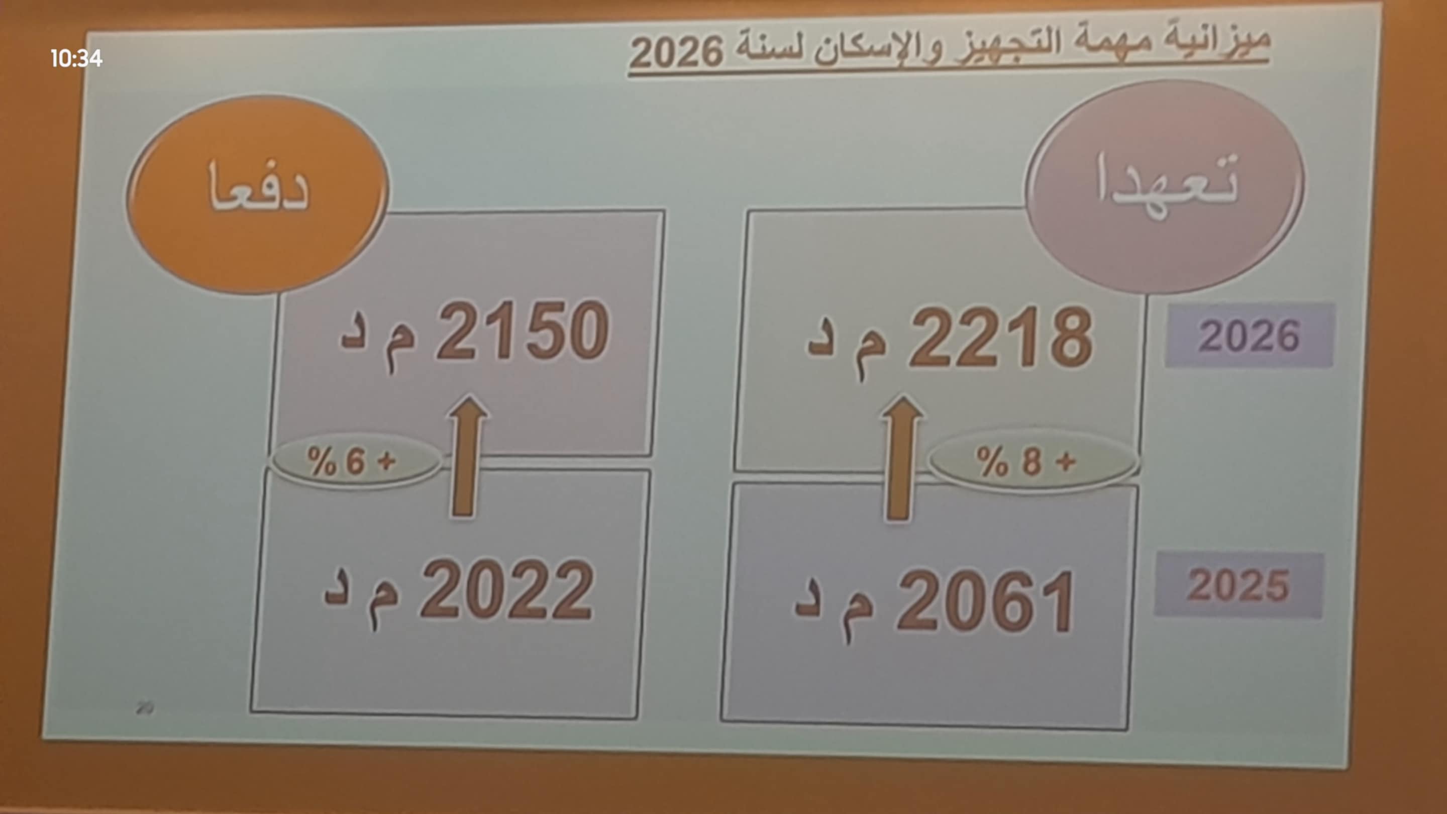 ويشار إلى أن ميزانية وزارة التجهيز والإسكان تنقسم إلى قسمين، الأول خاص بنفقات التعهد للوزارة وقدرت ب2218 مليون دينار بارتفاع 8 بالمائة مقارنة بسنة 2025.