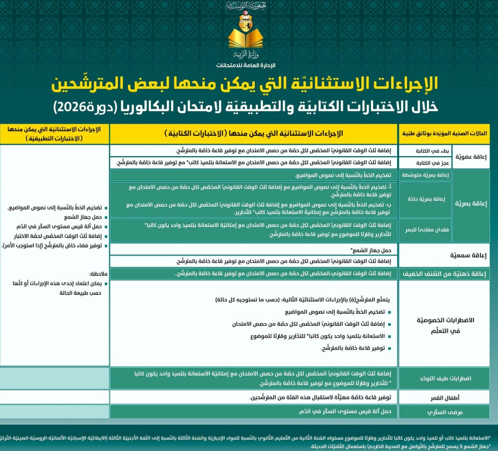 أعلنت وزارة التربية مساء اليوم الأحد 16 نوفمبر 2026, عن الإجراءات الاستثنائية التي تتعلق باجتياز امتحان الباكالوريا دورة 2026.