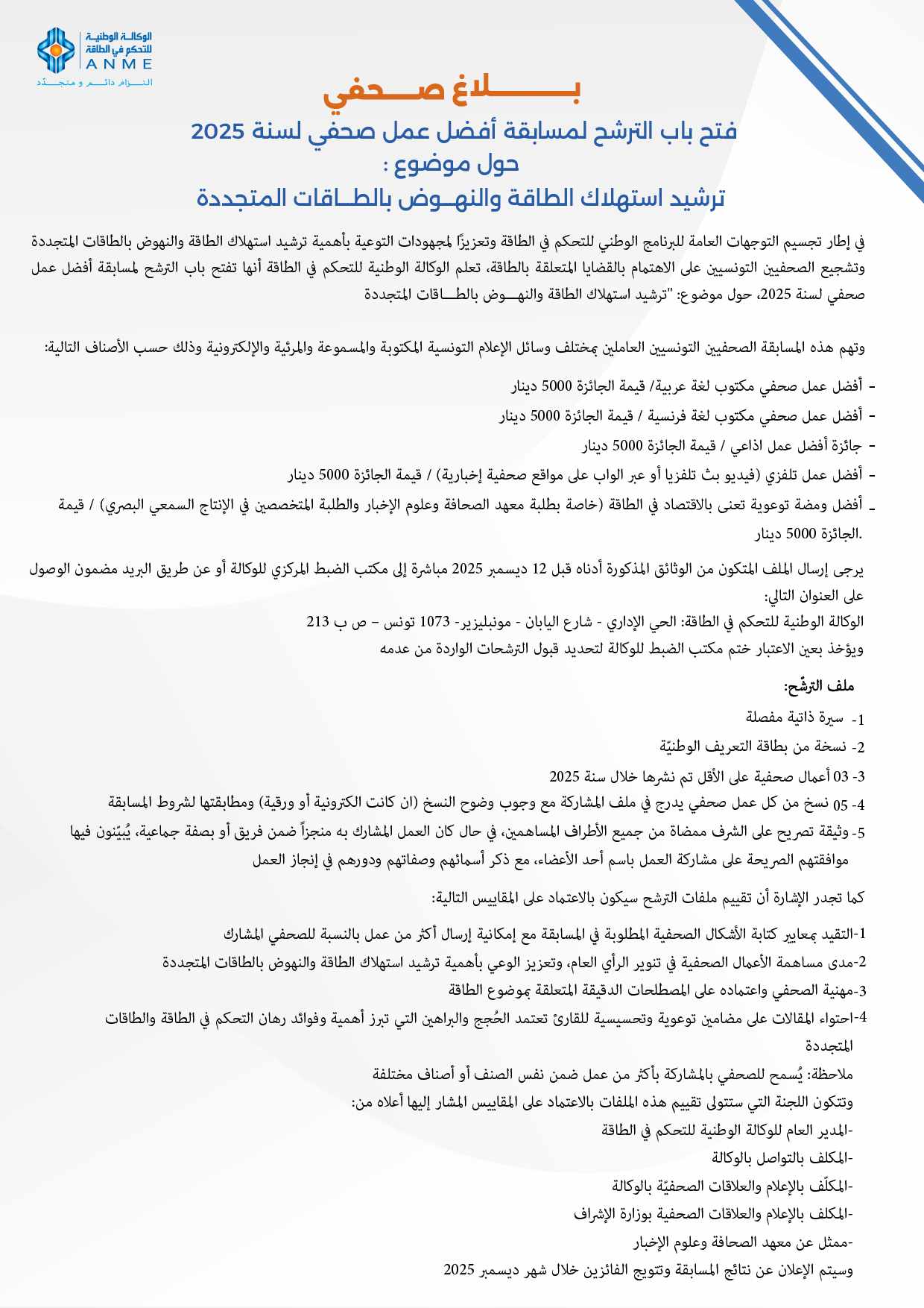 أعلنت الوكالة الوطنية للتحكم في الطاقة، التمديد في آجال قبول ملفات المشاركة في مسابقة أفضل عمل صحفي لسنة 2025 حول موضوع "ترشيد استهلاك الطاقة والنهوض بالطاقات المتجددة" إلى غاية 12 جانفي 2025، وذلك تلبية لطلب عديد الصحفيين.