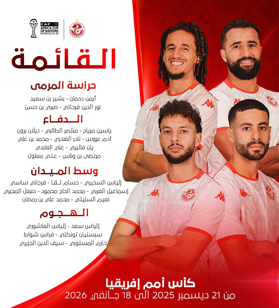 أعلن مدرب المنتخب الوطني سامي الطرابلسي اليوم في ندوة صحفية عن قائمة لاعبي المنتخب الوطني لكرة القدم المدعوين إلى منافسات كأس أمم إفريقيا والتي ستحتضنها المملكة المغربية من 21 ديسمبر 2025 إلى 18 جانفي 2026.