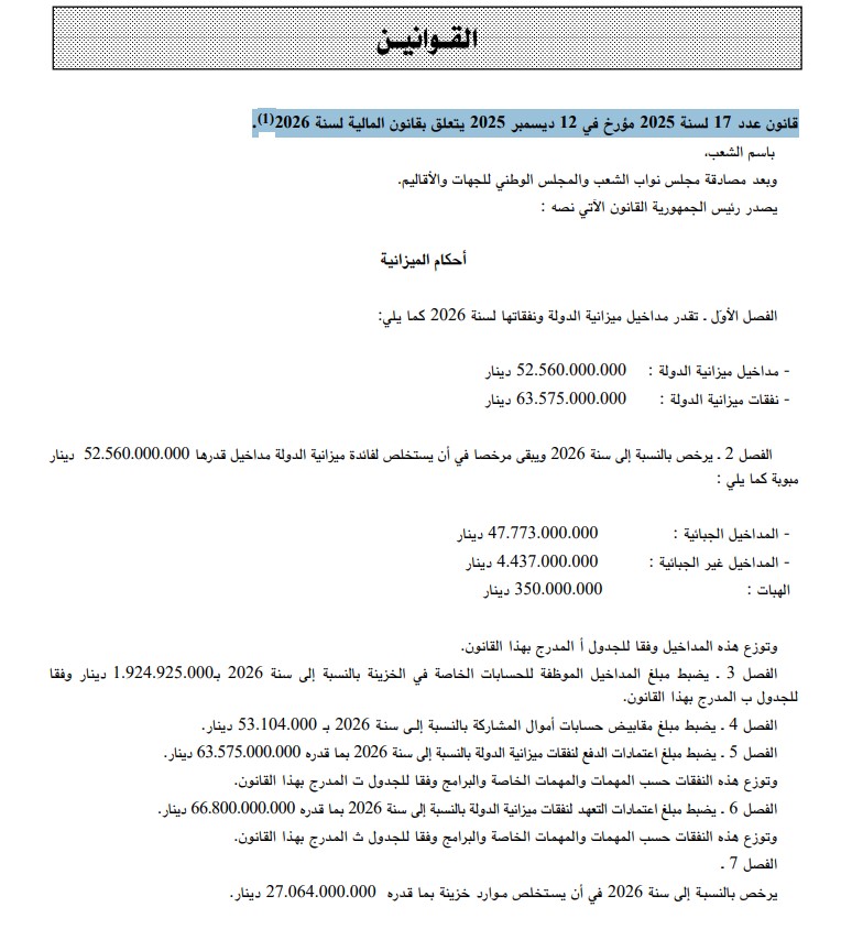 صدور قانون المالية لسنة 2026 بالرائد الرسمي للجمهورية التونسية