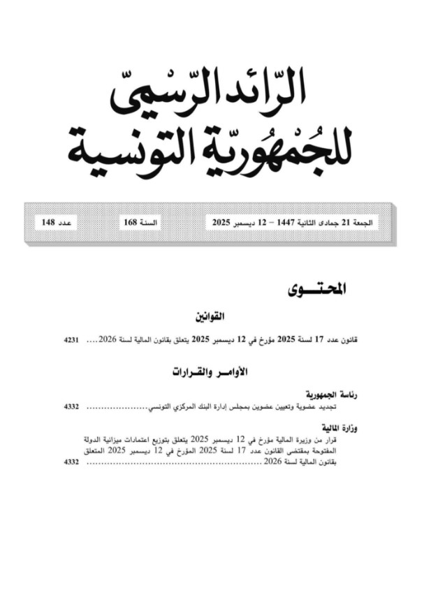 صدر اليوم الجمعة، بالرائــــد الرسمي للجمهورية التونسية عــــدد 148، القانون عدد 17 لسنة 2025، مؤرخ في 12 ديسمبر 2025، والمتعلق بقانون المالية لسنة 2026.