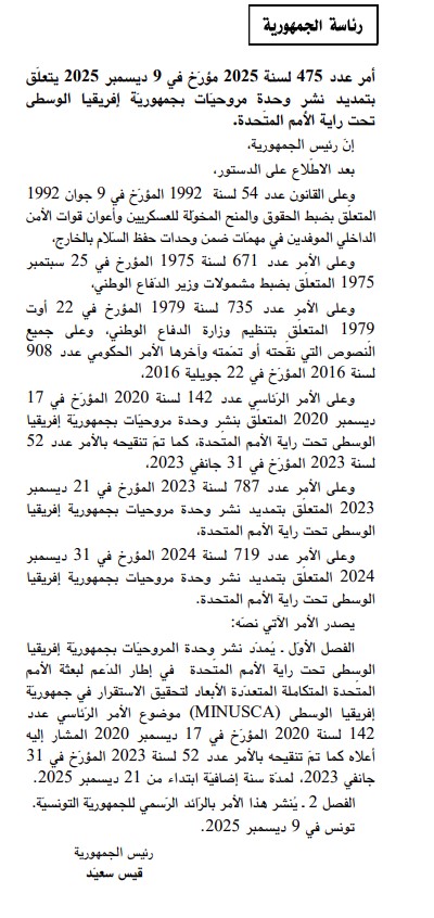 صدر بالرائد الرسمي للجمهورية التونسية بتاريخ اليوم الإثنين 15 ديسمبر 2025، أمر رئاسي عدد 475 لسنة 2025 مؤرخ في 9 ديسمبر 2025، يتعلق بالتمديد في نشر وحدة المروحيات بجمهورية إفريقيا الوسطى تحت راية الأمم المتحدة، لمدة سنة إضافية بداية من 21 ديسمبر 2025.