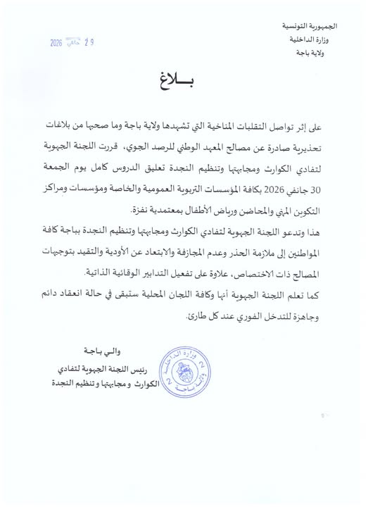 قرّرت اللجنة الجهوية لتفادي الكوارث ومجابهتها وتنظيم النجدة بباجة تعليق الدروس يوم غد الجمعة بكافة المؤسسات التربوية العمومية والخاصة ومراكز التكوين المهني والمحاضن ورياض الأطفال بمعتمدية نفزة وفق بلاغ أصدرته الولاية .