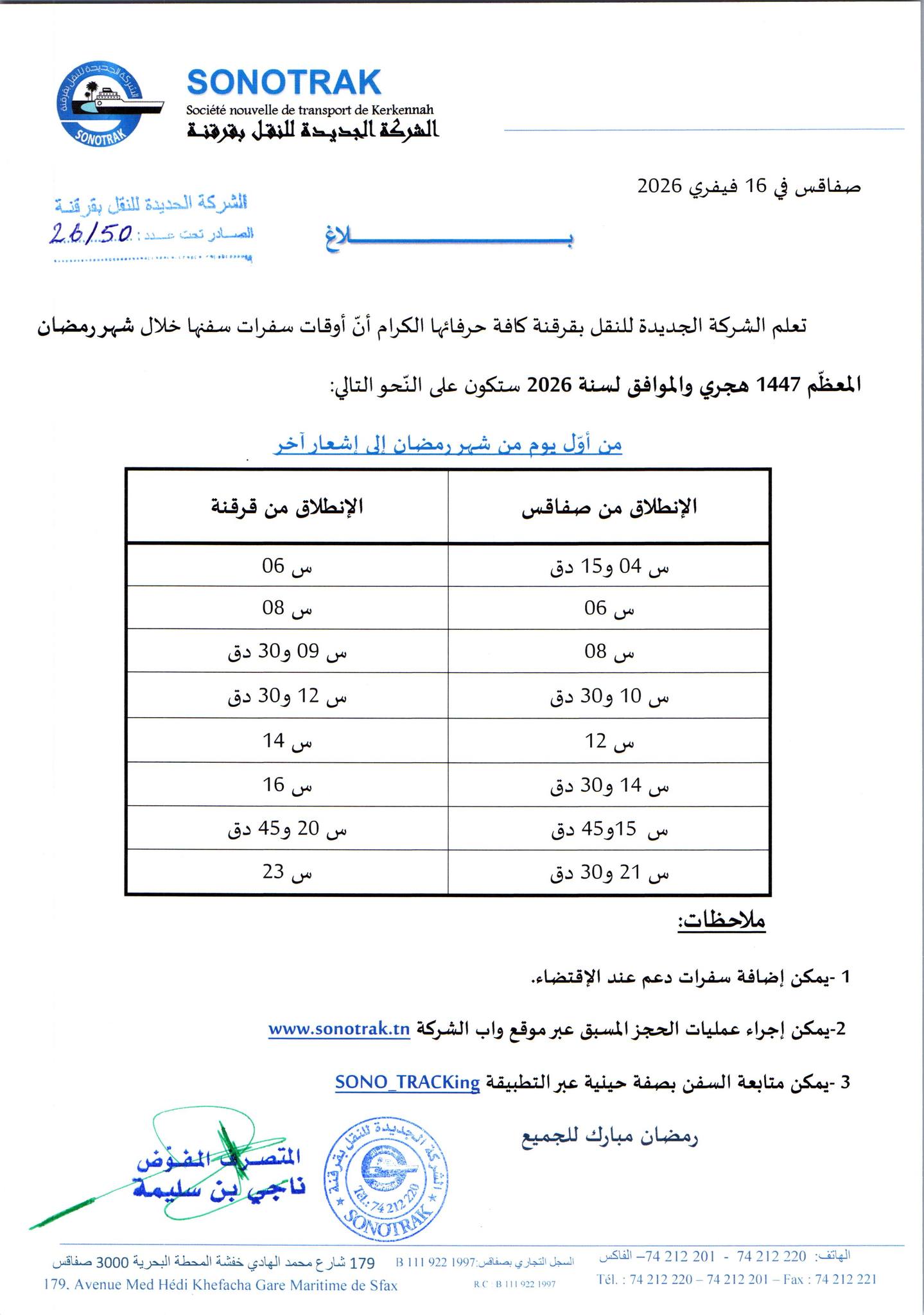 أعلنت الشركة الجديدة للنقل بقرقنة، اليوم الإثنين 16 فيفري 2026، عن أوقات سفراتها خلال شهر رمضان.