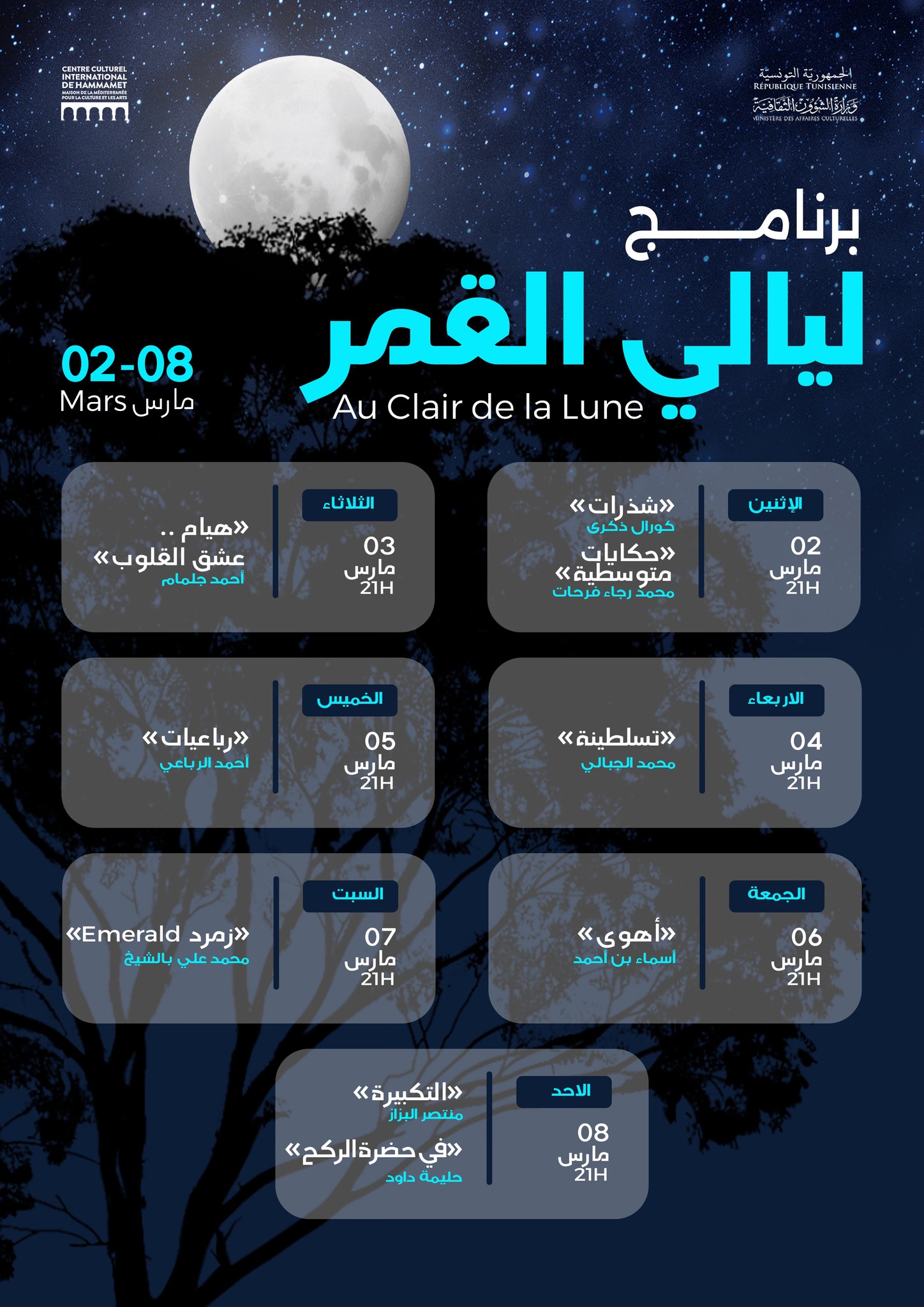 وفي ما يلي تفاصيل برنامج وسهرات ليالي القمر بدار سيباستيان في الحمامات: